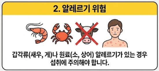 - 알레르기: 소고기나 상어(해산물) 알레르기가 있다면 원료를 꼭 확인하세요.