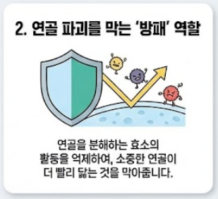 가장 중요한 기능입니다. 나이가 들면 연골을 파괴하는 효소가 활성화되는데, 콘드로이친은 이 효소의 작용을 억제합니다. 즉, 남아있는 연골이 더 이상 빨리 닳지 않도록 지켜주는 방패 역할을 하는 셈입니다.