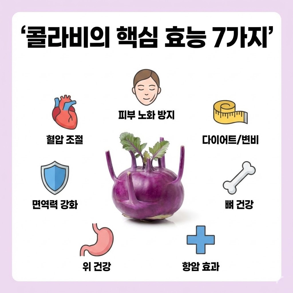 콜라비에는 칼륨이 풍부하게 함유되어 있습니다. 칼륨은 체내에 쌓인 나트륨을 배출시키는 역할을 하여 고혈압 예방에 도움을 줍니다. 짠 음식을 많이 섭취하는 한국인 식단에 꼭 필요한 채소입니다.