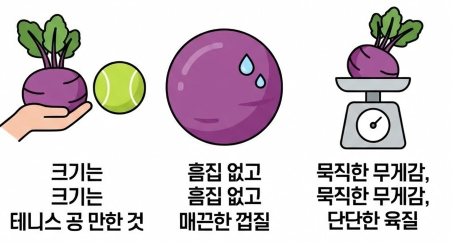 💡 고르는 팁: 크기가 너무 큰 것은 육질이 단단하고 당도가 떨어질 수 있습니다. 테니스 공 크기 정도가 가장 맛이 좋으며, 껍질에 흠집이 없고 묵직한 것을 고르세요.