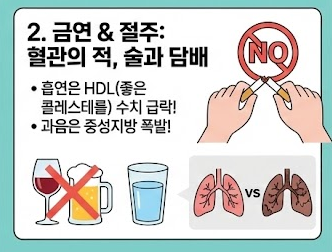 • 금연: 흡연은 좋은 콜레스테롤(HDL) 수치를 급격히 떨어뜨립니다. 혈관 건강을 위해 금연은 선택이 아닌 필수입니다.