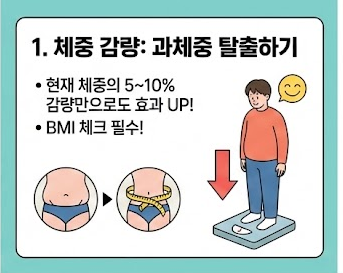• 체중 감량: 과체중이라면 현재 체중의 5~10%만 감량해도 콜레스테롤 수치가 유의미하게 떨어집니다.