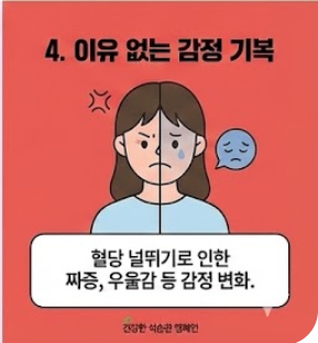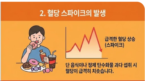 - 가짜 배고픔: 식사한 지 얼마 되지 않았는데도 금방 허기가 지고, 특히 단 음식이나 탄수화물이 당깁니다. (혈당이 급락하면서 뇌가 에너지가 부족하다고 착각하기 때문입니다.)