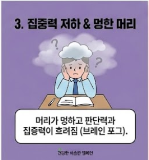 - 집중력 저하 및 브레인 포그: 머리가 멍하고 판단력이 흐려지는 느낌을 받습니다.