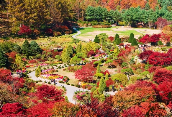 가을, 엽서 속 풍경을 실제로 만나고 싶다면 가평 아침고요수목원이 정답입니다! 한국적인 아름다움이 돋보이는 정원과 붉고 노란 단풍이 어우러져 한 폭의 수채화 같은 절경을 선사합니다.